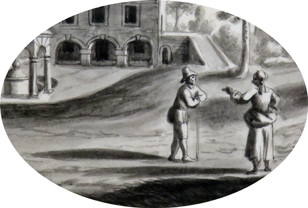 The discovery several years ago of an attractive, ink-on-card drawing, sold by a dealer in England, led to an interesting investigation of its artist and location with art detective work. We acquired it for our museum in Thailand to teach children about art, history and pleasure in study. Showing two pretty pavilions in trees, the smaller covering a fountain, with figures in the foreground, it looked professionally-drawn, and in very nice condition. We felt that it dated from the eighteenth or early nineteenth century. With no leaves on the ground, yet thin foliage on the trees, it looks like a scene from spring. It is first thing in the morning, because the figures standing on the road cast very long shadows and we now know that the sun in the drawing is coming from the east.